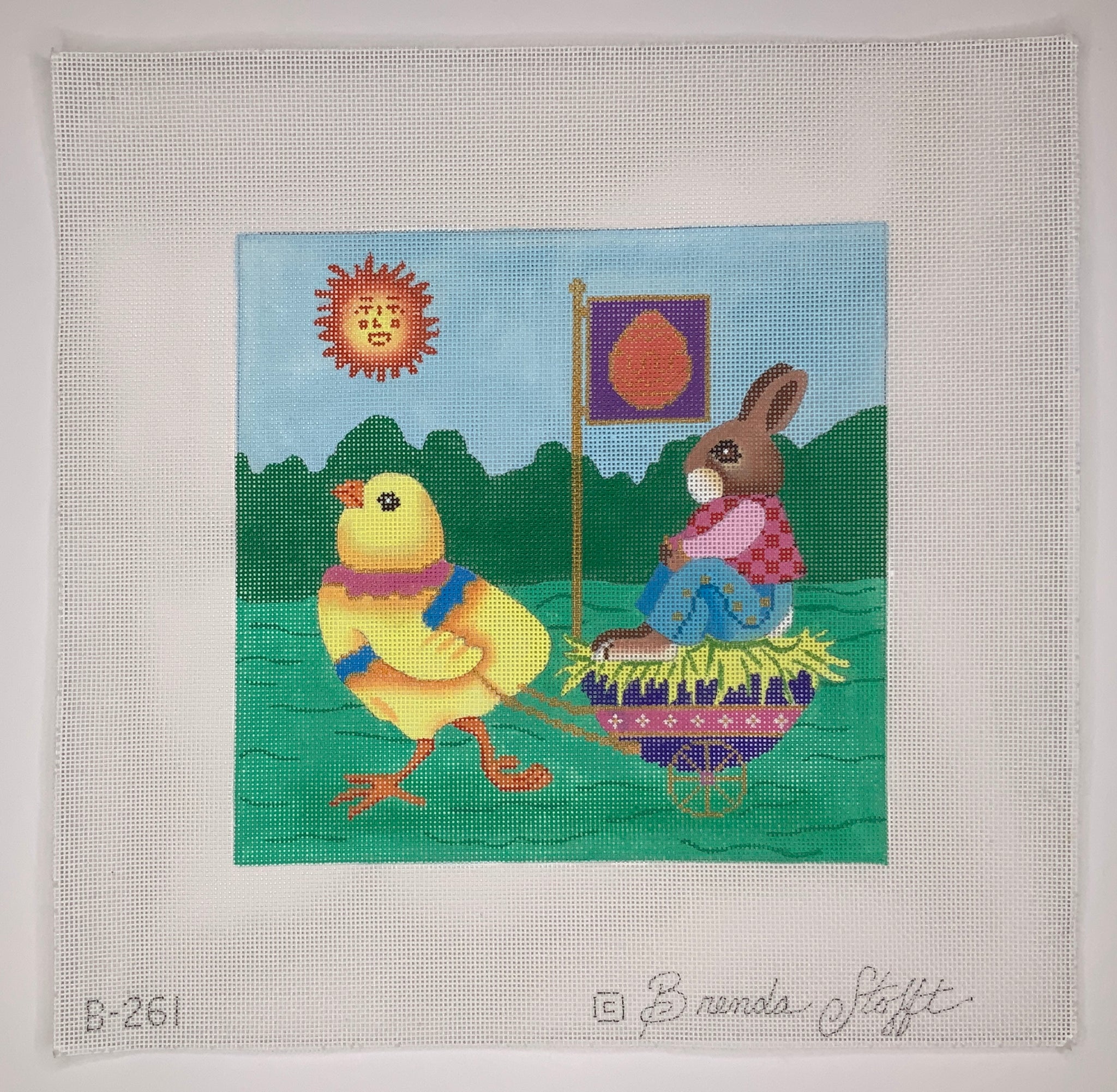 "Chick Pulling Bunny in Egg Cart" painted canvas by Brenda Stofft