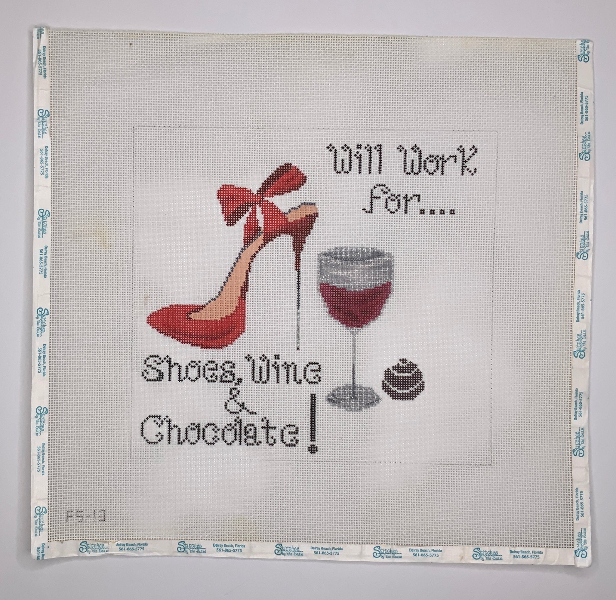 "Will Work for Shoes, Wine & Chocolate" painted canvas by Funda Scully