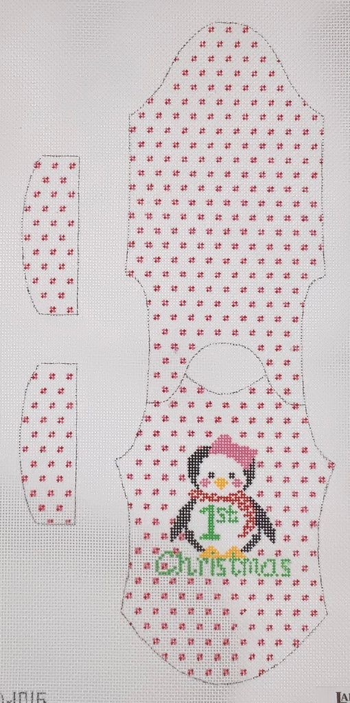 "1st Christmas Onesie Ornament - Penguin" painted canvas by Janice Holden