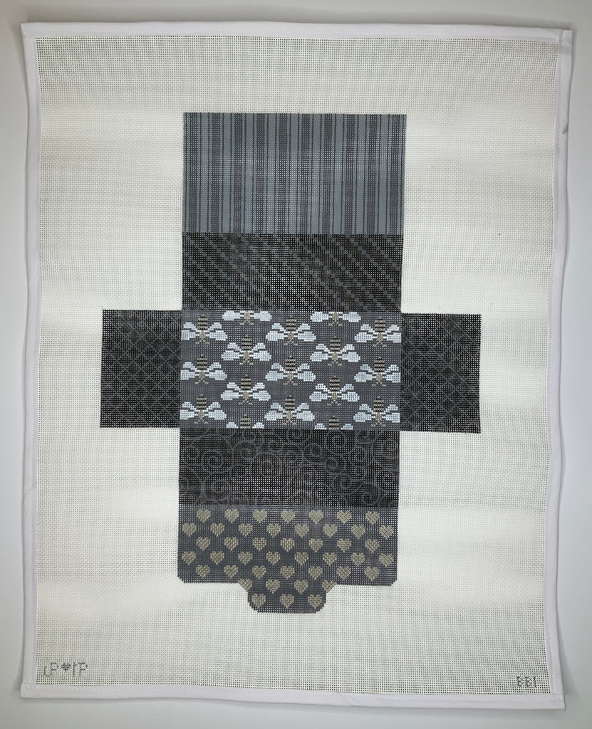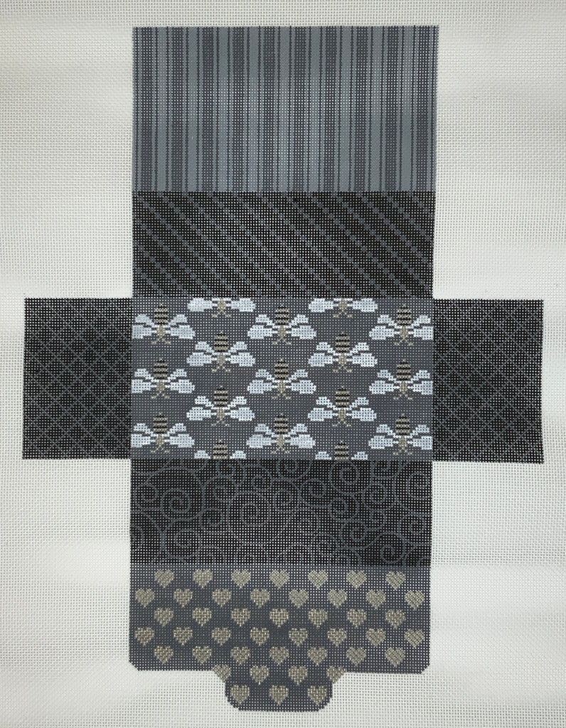 "Black & Grey Bees & Hearts Brick Bag (Purse)" painted canvas by JP Needlepoint