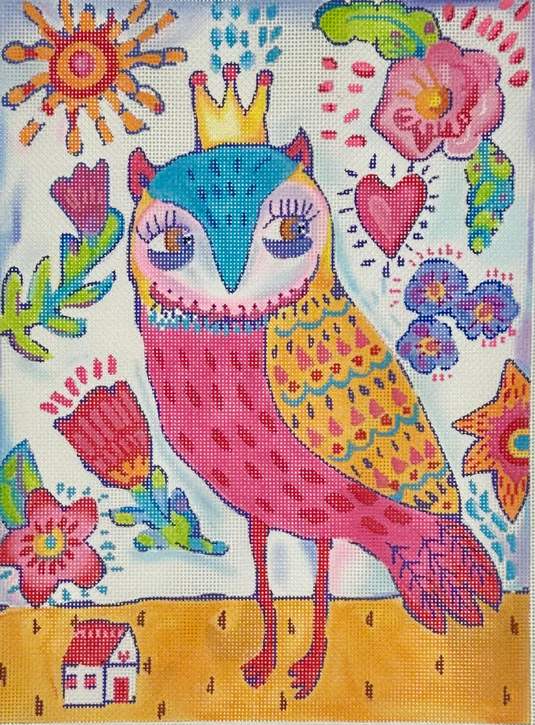 "Spunky Owl w/Crown and Flowers" painted canvas by Kate Dickerson, artwork by Julia Eves