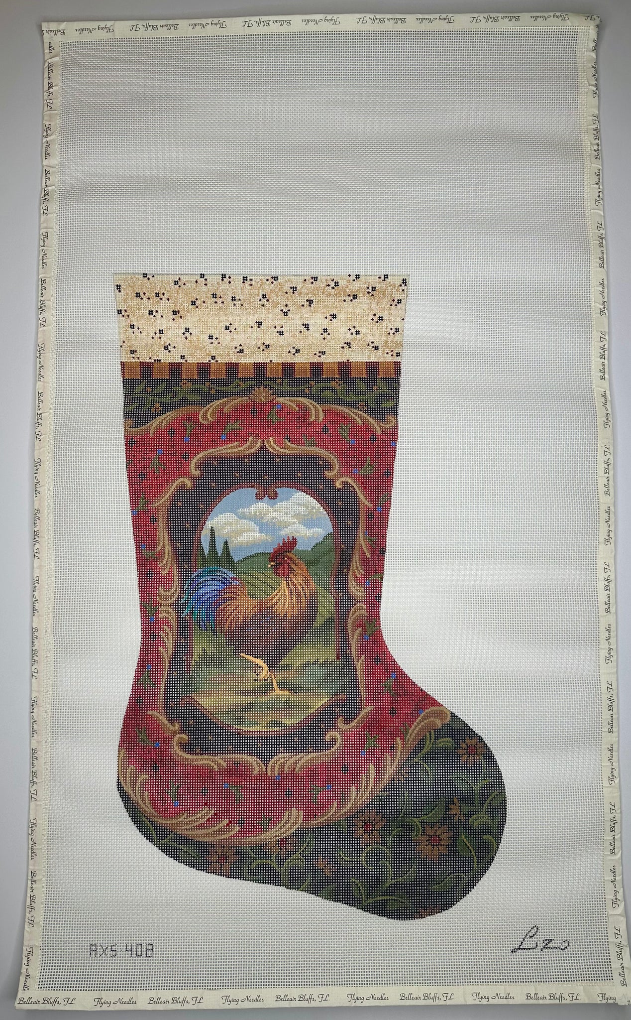 "Rooster Stocking" painted canvas by Liz Goodrick-Dillon