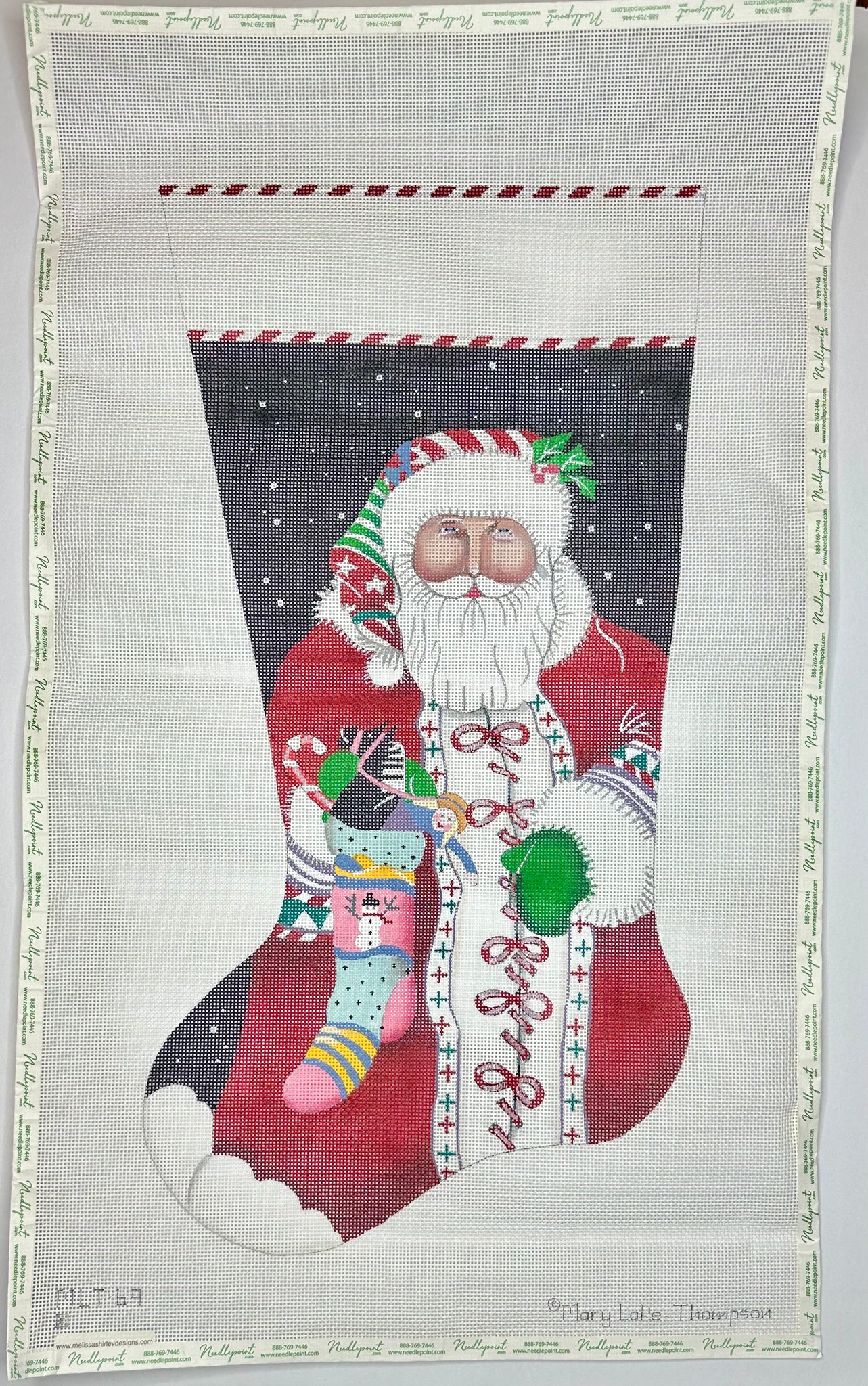 "Santa Sock Stocking" painted canvas by Melissa Shirley, artwork by Mary Lake Thompson