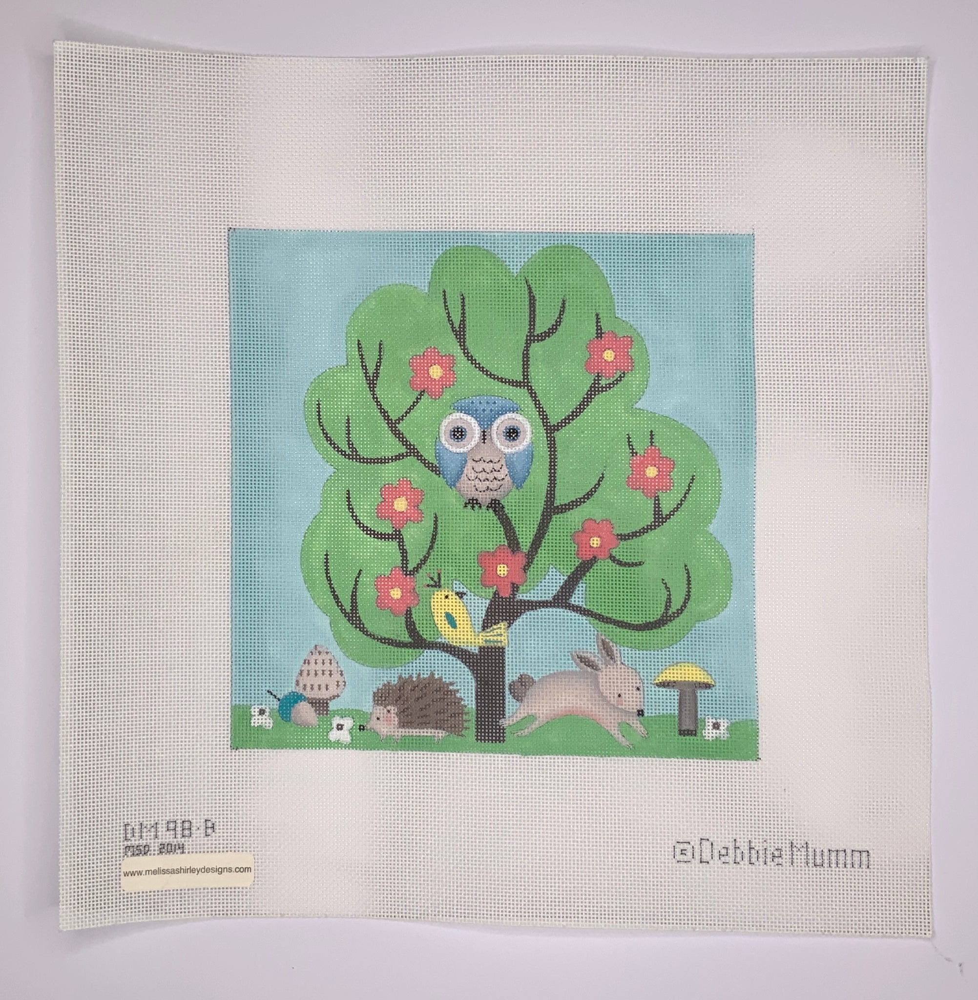"Blue Owl Tree" painted canvas by Melissa Shirley, artwork by Debbie Mumm