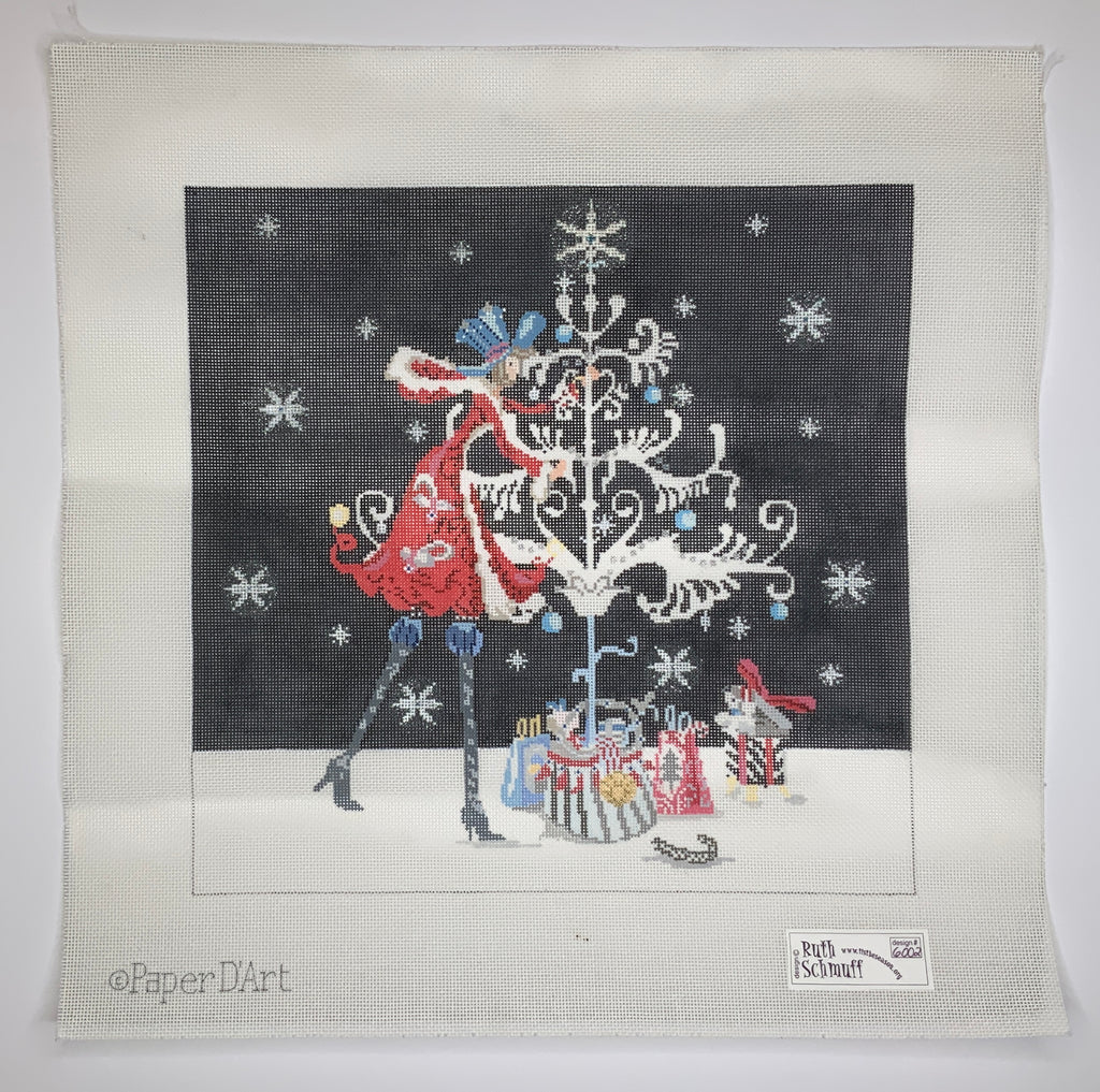 "Red Coat Tree Decorator" painted canvas by Ruth Schmuff, artwork by Paper D'Art