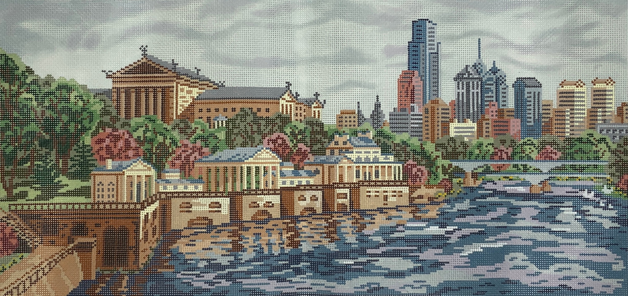 "Philadelphia Museum of Art/Waterworks" painted canvas by Needle Crossings