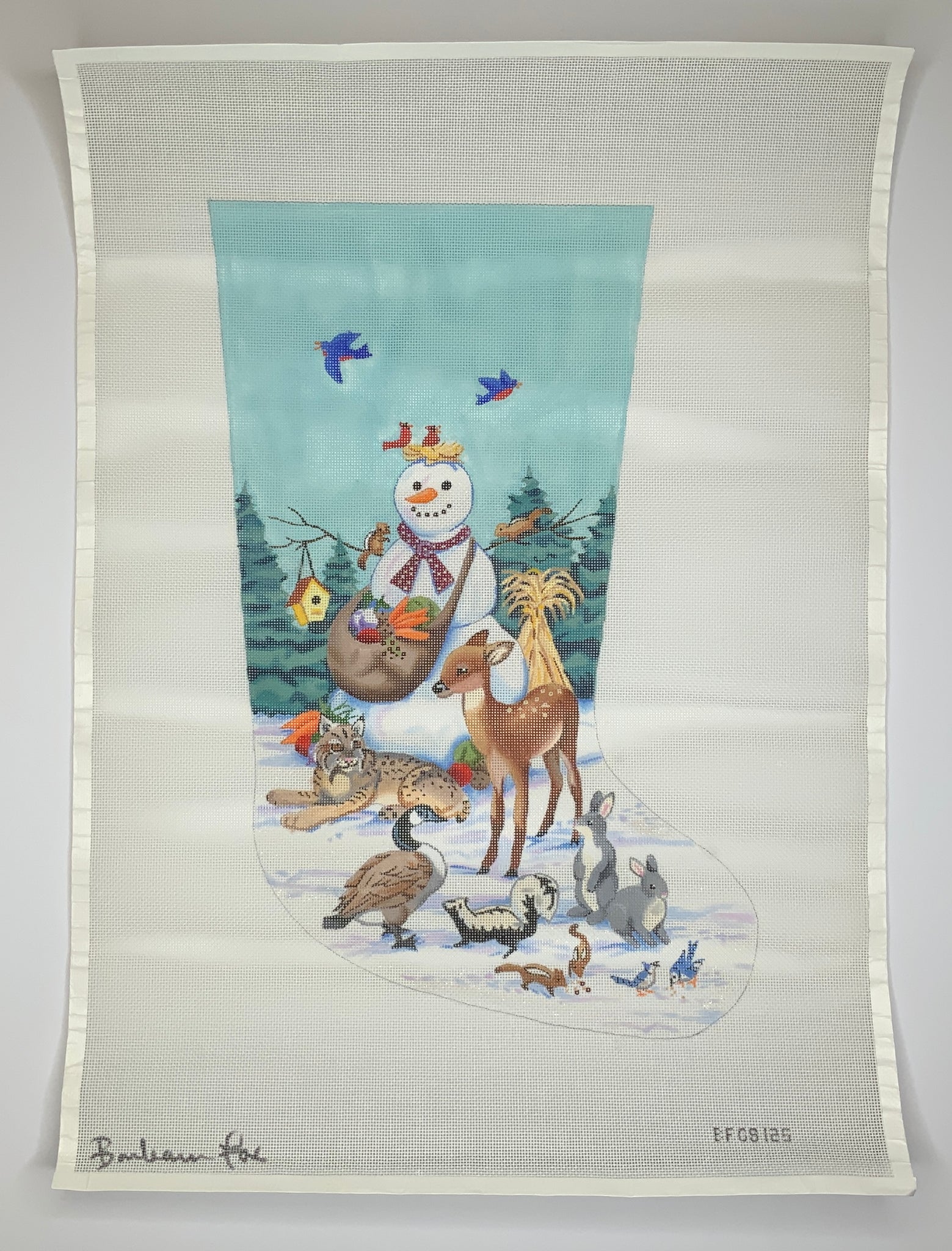 "Snowman & Animals Stocking" painted canvas by Barbara Fox